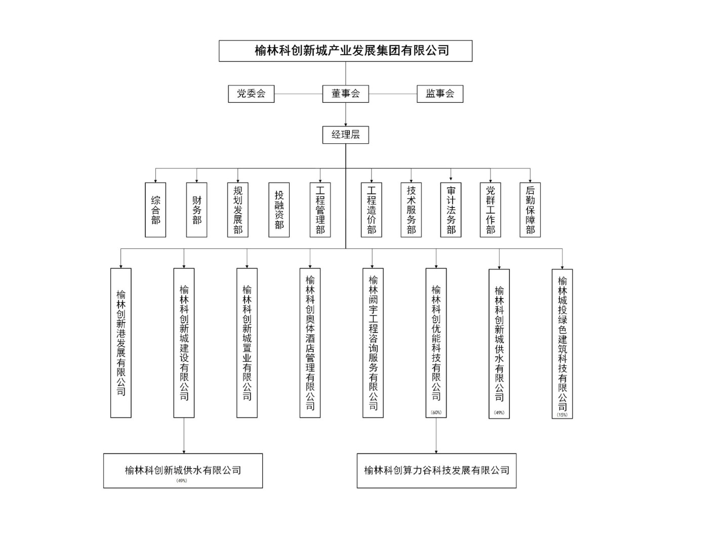 榆林科創新城產業發展集團有限公司,是根據《榆林市人民政府關于組建榆林科創新城產業發展有限公司的批復》(榆政函﹝2019﹞100號)文件精神,由榆林市國資委(已委托榆林科創新城管委會代管)、榆林市財經投資管理有限公司、陜西榆林能源集團有限公司按7:2:1的比例,共同出資60億人民幣組建的承擔科創新城開發建設、招商引資、投資運營、專業化服務等職能的集團公司。目前公司擁有榆林科創新城建設有限公司、榆林創新港發展有限公司、榆林科創新城置業有限公司、榆林科創奧體酒店管理有限公司等4個全資子公司,參股榆林城投綠色建筑科技有限公司(占股15%),與榆林市水務集團合資組建了榆林科創新城供水公司(占股49%),控股榆林科創優能科技有限公司(占股60%),控股榆林科創算力谷發展有限公司(科創優能占股100%)
